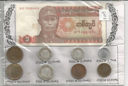 Lille samling fra Myanmar det tidligere Burma - pæn seddel og 8 kobber og sølvmønter - Pris kr. 100,-