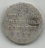 L-099 - Slesvig-Holsten 2,5 schilling / 1/24 speciedaler årg 1796 sølv 2,8 gr 0,37 lidt slidt eksemplar Pris kr. 155,-